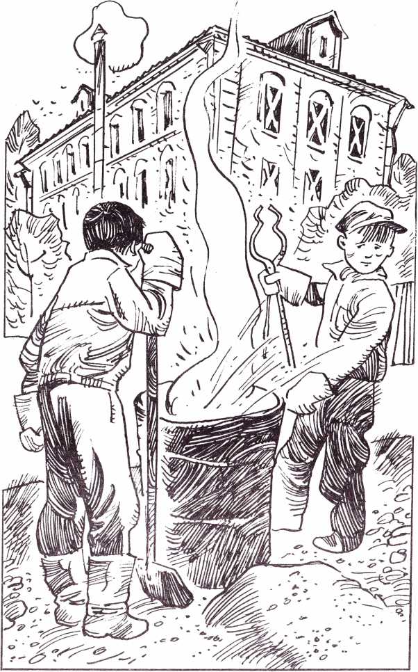И Андрейка бегал вокруг, громко плача и вытирая кулаком слезы. Черные от копоти люди толпились около развалин, звенели лопаты, с темных рабочих лиц каплями бежал пот…