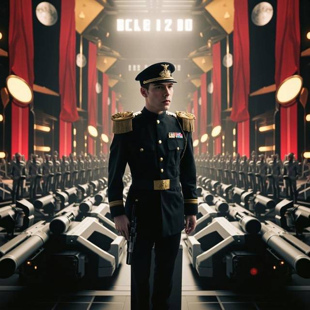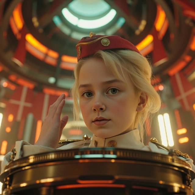 Торжественный церемониал. Официальный визит Императора-Кесаря Терры и Царицы Марсианской в Царство Лунное. Рота почётного караула, оркестр, зрители с флажками.