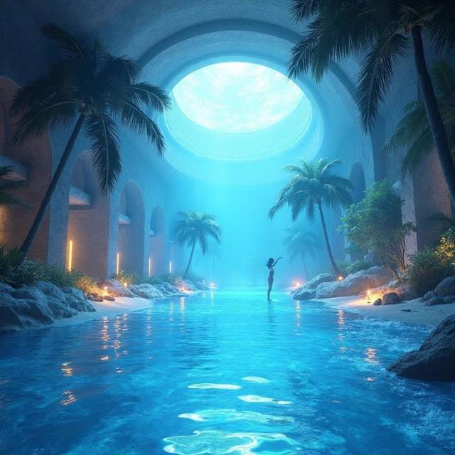 Новая затея моего папаши — переоборудовать технический резервуар воды в «море», сделать набережную, насыпать песочка, пальмы в кадках, вместо солнца излучатель. Механизмы в воде создают волны. Народу нравится.