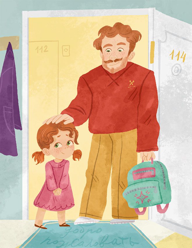 Мама подошла и открыла дверь. На пороге стояла девочка — с хвостиками, в ярком розовом платье. Рядом с ней — папа, державший маленький зелёный рюкзачок.