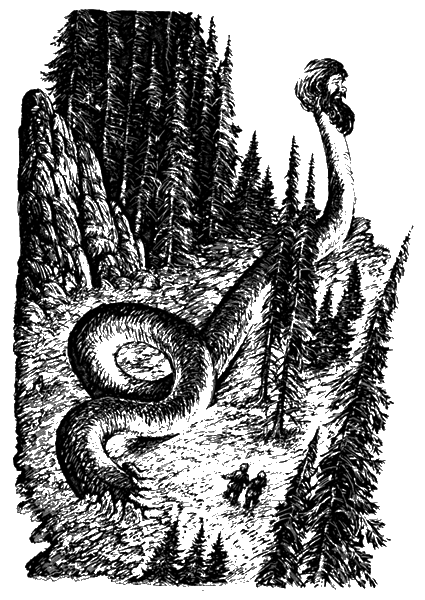 И вот видят ребята — человека того уж нет. Которое место до пояса — все это голова стала, а от пояса шея. Голова точь-в-точь такая, как была, только большая, глаза ровно по гусиному яйцу стали, а шея змеиная. И вот из-под земли стало выкатываться тулово преогромного змея. Голова поднялась выше леса.