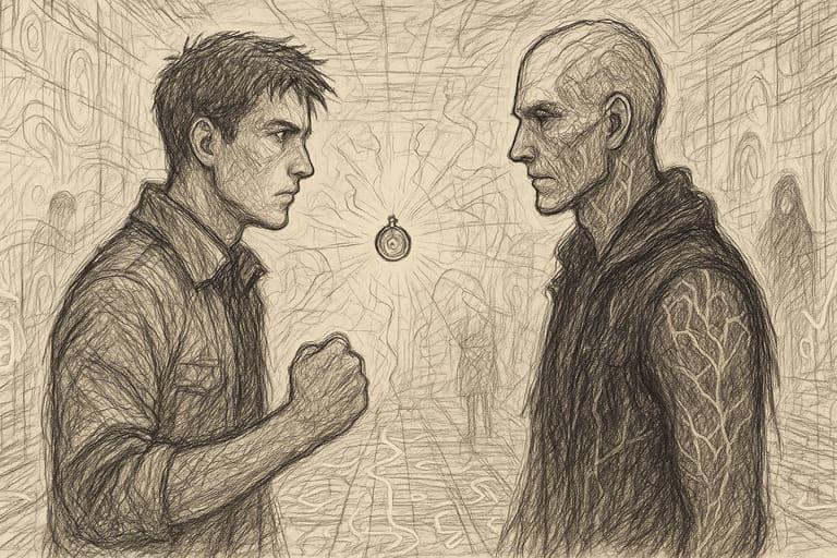 Когда он обернулся, я почувствовал странное дежавю. Его лицо казалось смутно знакомым, словно я видел его раньше, но не мог вспомнить где. Он потёр правый висок жестом, который я часто делал сам, когда был озадачен.