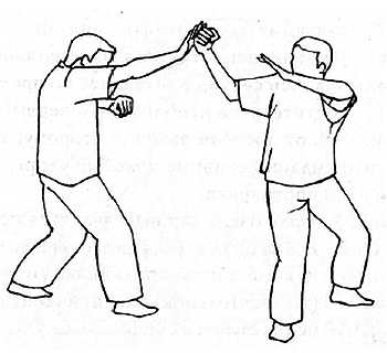 При отсутствии напарника лобовые атаки нарабатываются со стволом дерева, стеной, подвешенным боксерским снарядом и т. п. Отойдите в сторону и, приняв боевую позицию, стремительно сближайтесь с объектом атаки, нанося разнообразные удары. Не бейте слишком сильно, чтобы не повредить кулаки. Сначала выполняйте удары как надавливания (или толчки), постепенно увеличивая скорость и жесткость атак. В этом случае удары-надавливания превращаются в сильные и высокоскоростные движения. Чтобы понять, как это происходит, попробуйте с увеличением скорости выполнять удары-толкания в живот своего напарника. На малых скоростях это всего лишь легкие толчки, но с ростом скоростей они превращаются в очень опасные удары.