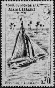 Преодолев большие трудности и опасности, он вернулся летом 1929 г. во Францию на своей повидавшей виды яхте типа тендер «Фейеркрест». Только спустя 40 лет французская почта выпустила марку, посвященную славному мореходу. На крупной сине-голубой марке на фоне поросших пальмами тропических атоллов изображена яхта «Фейеркрест», управляемая А. Жербо. Над яхтой текст: «Кругосветное путешествие Аллена Жербо (1923–1929 гг.)» — и небольшой портрет в профиль самого путешественника (рис. 25).