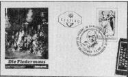 Композиторы-филателисты создали уже немало песен и маршей, посвященных филателии. Их нередко можно услышать на филателистических выставках в Праге и Люксембурге, Париже и Вене. Весьма популярен «Филателистический вальс» композитора Роберта Штольца. Его перу принадлежит свыше 60 оперетт («Остров грез», «Трое с берегов Дуная», «Военный смотр» и др.), которые много лет не сходят со сцен крупных городов Европы. Благодарные венцы-меломаны с почтением называют Штольца «последним из королей венского вальса». Композитор считал филателию бдним из самых прекрасных увлечений, наводящим мосты между народами и поколениями. В честь Роберта Штольца выпущены марки в Австрии, Западном Берлине, Бельгии, Сан-Марино, Парагвае. За последние 20 лет почта во многих концах планеты применила более 50 специальных штемпелей, посвященных композитору и его произведениям. На рис. 48 показан конверт первого дня выпуска марки, посвященной оперетте Штольца «Два сердца в три четверти такта». На штемпеле — портрет композитора (иллюстрация конверта посвящена оперетте Иоганна Штрауса-сына «Летучая мышь»).