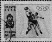 В 1968 г. появилась польская серия, посвященная XIX летним Олимпийским играм в Мехико. На марке, изображающей борьбу за мяч баскетболистов (мужчин), на груди одного из них ясно читается игровой номер «3» (рис. 70), хотя даже начинающие болельщики знают, что в баскетболе игроки носят номера с 4-го по 15-й. Странным образом та же ошибка через два месяца проникла и в олимпийскую серию Марокко, где на 20-сантимовой марке изображен баскетболист с той же злополучной тройкой.