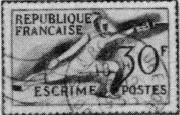 В 1953 г. поступила в обращение французская серия, посвященная XV летним Олимпийским играм в Хельсинки. На марке номиналом 30 франков фехтовальщик держит рапиру в левой руке (рис. 71). Многие сочли это за ошибку, но французская почтовая администрация заявила, что автор марки прав: Кристиан д'Ориола, завоевавший две золотые медали в фехтовании на рапирах, — левша.