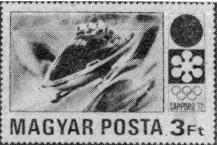 В венгерской серии, посвященной зимним Олимпийским играм 1972 г. в Саппоро, есть марка, изображающая момент соревнования по бобслею. В честь страны — хозяйки Олимпиады «боб» назван «Япония». Но удивительно, что в нем мчатся не два или четыре спортсмена, как полагается, а…три. То ли это что-то новое в данном виде спорта, то ли четвертого на большой скорости потеряли (рис. 72).