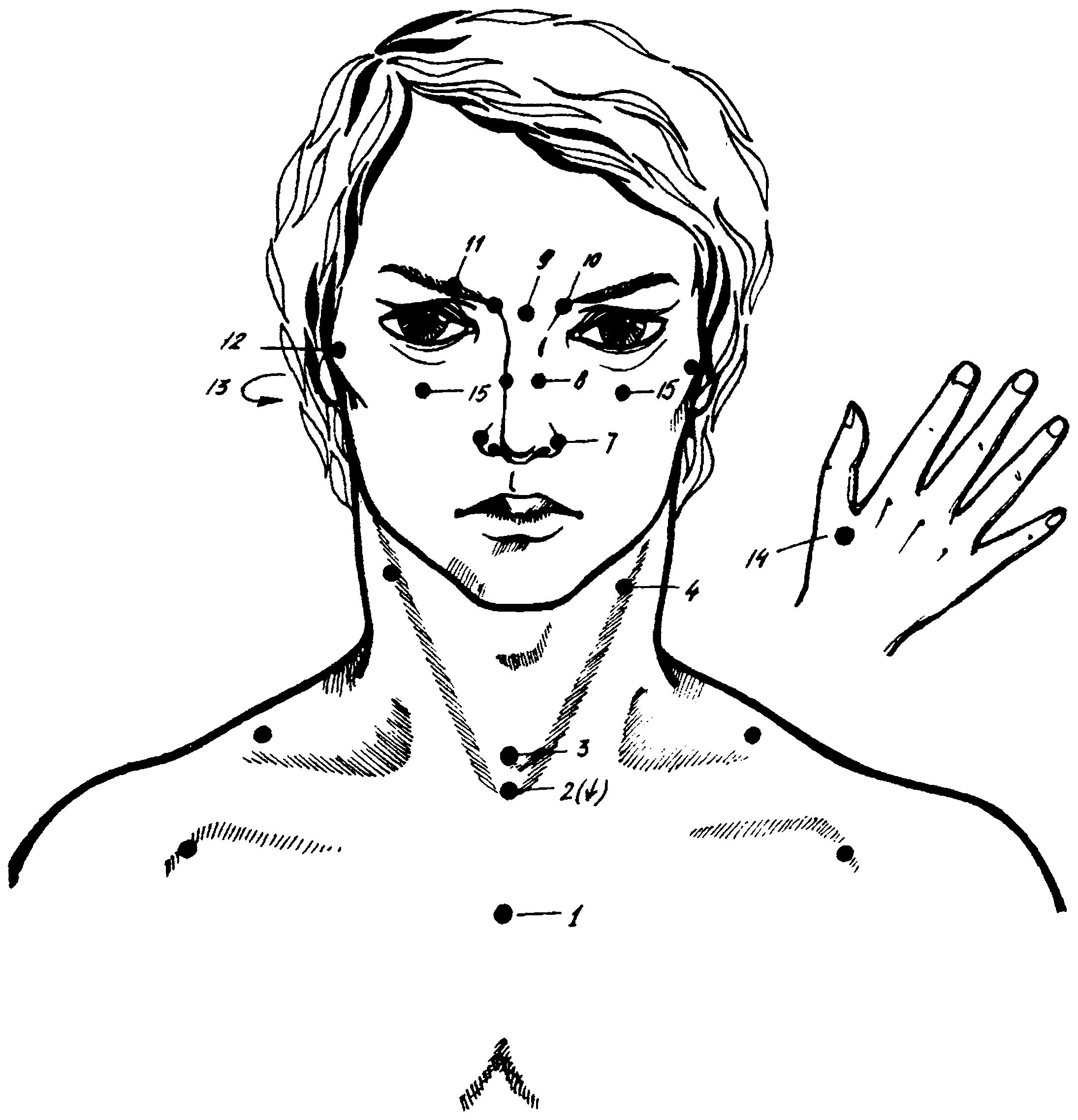 2 — торец грудины. Ставим палец вертикально сверху между концами ключиц, на торец грудины и прерывистым нажимом сверху вниз. Способствует снятию сухого кашля с глотки и частично трахеи. Кроме того, так как массаж этой точки способствует снятию отека слизистой голосовой щели, он используется при осиплости голоса у лекторов, воспитателей, певцов и т. е. всех тех, кто много говорит, А при стенозах — это одна из основных точек.