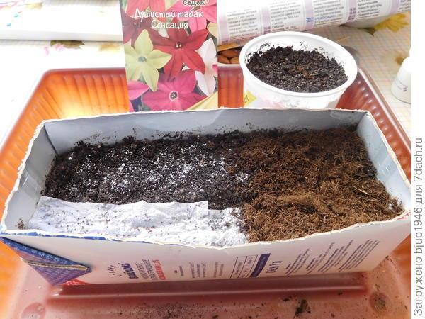 Сколько сеять? Тут я могу только рассказать, как делали мы. Участок под картошкой у нас примерно 8х8 метров. Сеяли мы тогда душистый табак в молочные пакеты как на фото.