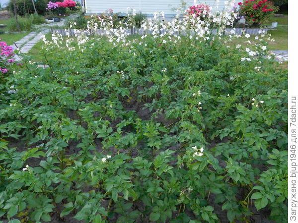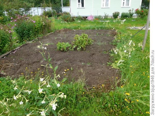 5 августа 2020 г. незадолго до уборки картошки. Белые цветы по дальней стороне это посаженный Душистый табак, Одинокий куст справа – самозванец. Рассада цветов в обоих случаях была посеяна в единственный стакан из-под сметаны.