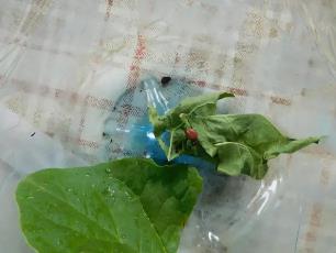 Личинки в пластиковой банке: маленькая уже засохла, большая вполне живая, а средняя слегка шевелит лапами лёжа на боку (а может быть уже и не шевелит, а мне это померещилось?). Листья Душистого табака и листья картошки погрызены: