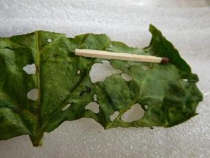 При этом, первые дырки были значительно крупнее последующих, а начиная с 21-го числа жуки и личинки бесцельно бродили по свежим листьям и делали вид, что едят. Когда они уползали на новое место, проеденных дырок видно не было.