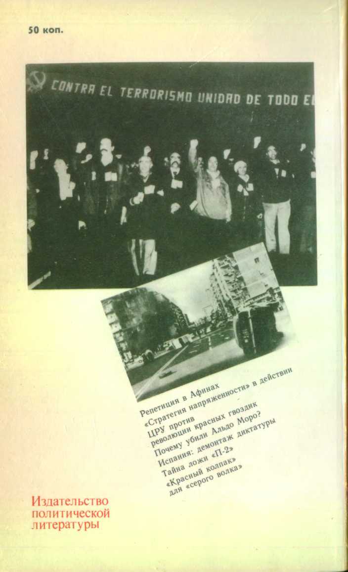Эта тайная война не затихает ни на один день, она продолжается и сейчас: то из одной, то из другой страны поступают сообщения о политических убийствах и тайных заговорах. Но если исполнители разработанной ЦРУ «стратегии напряжённости» выступают под самой разной личиной — матёрых неофашистов, правых и «левых» террористов, генералов-путчистов, вынашивающих планы правых переворотов, то покровитель у них один — наиболее реакционные круги империалистических государств, прежде всего США, пытающиеся любой ценой затормозить поступательное движение вперёд сил прогресса, нанести удар по демократическим партиям и организациям, всему организованному движению трудящихся, добиться сдвига вправо на политической арене западноевропейских стран.