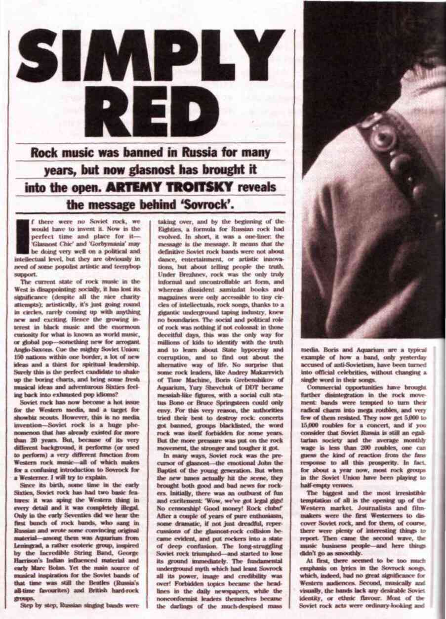 Во многом советский рок был предтечей гласности — для молодого поколения он стал в эмоциональном плане Иоанном Крестителем. Но когда новые мелодии вышли наконец на сцену, для исполнителей рока это имело как положительные, так и негативные последствия. Сначала все предавались восторгу и ликованию: «Ого, нам официально разрешили выступать! Никакой цензуры! Хорошие деньги! Создаются рок-кпубы!». На смену незамутненному энтузиазму первых двух-трех лет пришло осознание конфликта между роком и гласностью — их столкновение привело рок-музыкантов в глубокое замешательство. Долго боровшийся за право на существование советский рок наконец-то праздновал победу — и одновременно начал терять почву под ногами. Фундаментальный подпольный миф, благодаря которому Соврок и обрел свою мощь, свой имидж и завоевал доверие масс, ушел в небытие! Запрещенные темы превратились в заголовки ежедневных газет, а нонконформистские рокеры стали любимыми персонажами столь презираемых ими ранее массмедиа. Борис и «Аквариум» — типичный пример того, как группа, только вчера обвинявшаяся в антисоветизме, превратилась в национальную знаменитость, хотя в ее песнях не изменилось ни слова.