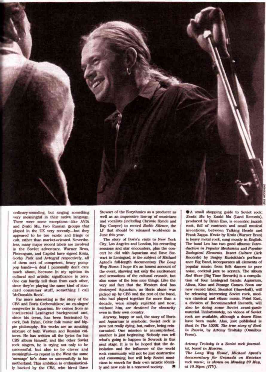 История приездов Бориса в Нью-Йорк, Лос-Анджелес и Лондон, репортажи о сеансах звукозаписи и встречах со звездами, а также описание концерта, который он сыграл в Ленинграде вместе с «Аквариумом» и Дэйвом Стюартом, стали канвой для полнометражного документального фильма Майкла Аптеда «The Long Way Ноmе». Надеюсь, что это честный фильм, в котором рассказывается не только о волнующих и сенсационных сторонах культурного крестового похода, но и о менее приятных вещах. Как, например, о том крайне печальном факте, что контракт с западной фирмой разрушил «Аквариум», потому что CBS выбрала только Бориса, а остальных участников группы, игравших вместе с ним более десяти лет, попросту отвергла. И теперь, без солиста, они обречены на безвестность даже в собственной стране.