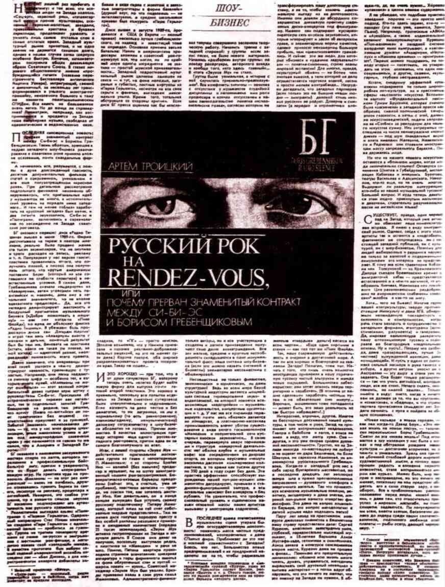 И это хорошо — притом, что я от души сочувствую БГ, которому теперь очень нелегко будет найти новую фирму для выпуска почти готовой второй пластинки. Это хорошо и правильно, поскольку все попытки «сделать» на Западе советских суперзвезд были спекулятивными и надуманными. Если взглянуть на дело честно и без демагогии, то ни заграница, ни мы к нормальному (то есть равноправному, взаимовыгодному, нежульническому) деловому сотрудничеству в шоу-бизнесе абсолютно не готовы. Причин множество. В качестве иллюстрации приведу историю еще одного русско-западного рок-про-екта, притом едва ли не самого благополучного из всех.