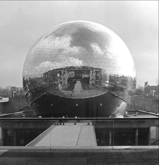 Банальность приема не исчезает полностью, но почти стирается, когда взаимодействие элементарной формы панорамного кинотеатра в парижском парке Ла Виллет с вполне тривиальной архитектурной формой павильона и подвижностью облаков образует достаточно сложный кинетический сценарий. Все началось с живописи Ван Эйка и Тициана, встроивших вертикаль зеркала в интерьер, за счет чего пространство в раме картины начало тонкую игру со зрителем. И все же нарушение тысячелетней традиции достаточно себя исчерпало.