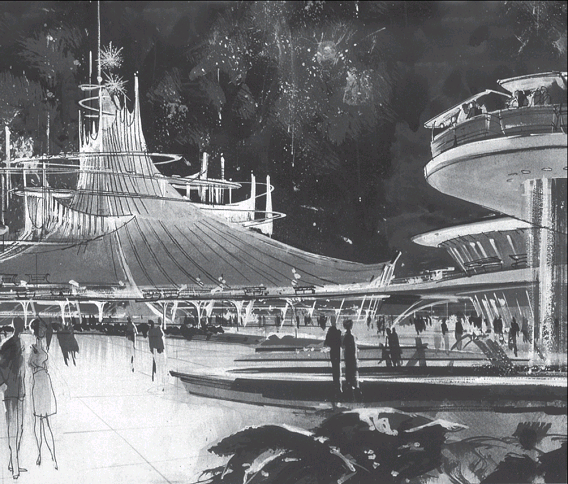 Архитектура зрелища оказалась сильнее архитектуры бытия и оказывает на нее все растущее воздействие. Бакминстер Фуллер создавал свои геодезические купола и сферы ради того, чтобы экономить материал. В Орландо эта же форма стала оболочкой «Мира Будущего». Уже оттуда, из Диснейленда та же форма была перенесена в гавань Генуи. Джон Хенч, многолетний дизайнер Уолта Диснея, вынуждал архитекторов разыгрывать пространственную форму ради сценария такого пребывания в зачарованном мире Микки-Мауса, когда грань между родителями и детьми стирается. Не удивительно, что теперь магазин может быть покрыт блестками, как платье Золушки, а замок, отчасти копирующий реальную сказку австрийского замка, заимствованную у братьев Гримм, построен.