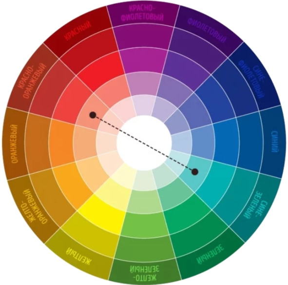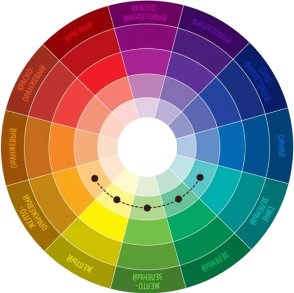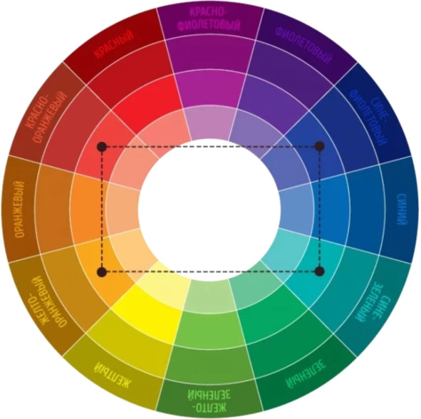 Согласно теории цвета, гармоничные цветовые сочетания получаются: