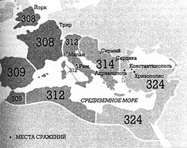 Союзники были еще в Милане, когда пришло известие, что Максимин вторгся на территорию Лициния и захватил город Византии. Похоже, что он считал войну неизбежной и решил ударить первым. Но Лициний действовал быстро, и Максимин был еще возле Византия – позднее Константинополь, а сейчас Стамбул, – когда противник появился перед ним с менее многочисленной армией и разбил его. Максимин был вынужден бежать и вскоре умер.