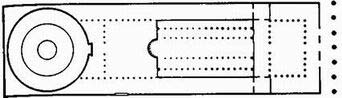 Типичный план христианских церквей при Константине, с рядами колонн, образующими несколько нефов (в данном случае пять). Обратите внимание также на апсиду и атриум.