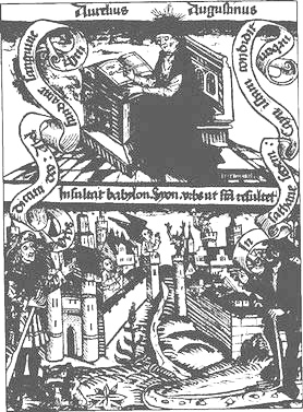 Гравюра на дереве из "Града Божьего" Августина, издание 1489 года. В верхней части гравюры Августин пишет свою книгу. Внизу – два города, один под покровительством Авеля, а другой – Каина. Обратите внимание на то, как ведут себя бесы из города справа.