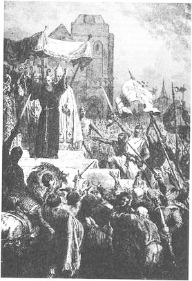 В то время во многих уголках Европы народ бедствовал из-за неурожая и эпидемий. Поэтому призыв пойти воинами Христа в дальние страны был восторженно встречен как простым народом, так и аристократией. Апокалиптическим мечтам, веками подавлявшимся и таившимся, теперь можно было предаваться в открытую. Многие видели кометы, ангелов или Святой город, явившийся над горизонтом. Вскоре разнузданная, оголтелая толпа крестоносцев под предводительством не сумевшего призвать их к дисциплине Петра Пустынника двинулась в Иерусалим. На своем пути они, как саранча, уничтожали все, им приходилось вступать в бой с другими христианами, защищавшими свое добро и свой урожай. Война против неверных обернулась также уничтожением тысяч иудеев. В конце концов большая часть крестоносцев первой волны погибла, а более организованные ряды других крестоносцев пополнялись немногими.