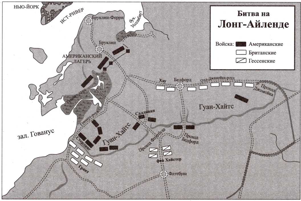 На следующий день после высадки Хау Вашингтон, ничего не зная о положении своей группировки на Лонг-Айленде, послал туда еще шесть полков и выпустил приказ, содержавший настоятельную просьбу своим солдатам «вести себя как подобает мужчинам». Хотя очередная «проповедь» Вашингтона сводилась к защите «дела» («Приближается час, когда от чести и успеха нашей армии будет зависеть безопасность нашей истекающей кровью отчизны»), там содержались угрозы, ссылки на недавнюю историю и инструкции, как вести себя под огнем врага. «Офицеры и солдаты, помните, что вы являетесь свободными людьми, сражающимися за ценности свободы! Рабство уготовано вам и вашим потомкам, если вы не будете вести себя, как положено мужчинам! Вспомните, как жестокие захватчики ни в грош не ставили вашу храбрость и ваш дух, проявившиеся под Бостоном, Чарлстауном [отсылка к Банкер-Хиллу. — Примеч. авт.] и в других сражениях! Помните, что вы — храбрые люди, сражающиеся за свою собственную страну ради достойнейшего из всех возможных дел против презренных наемников» [609] .