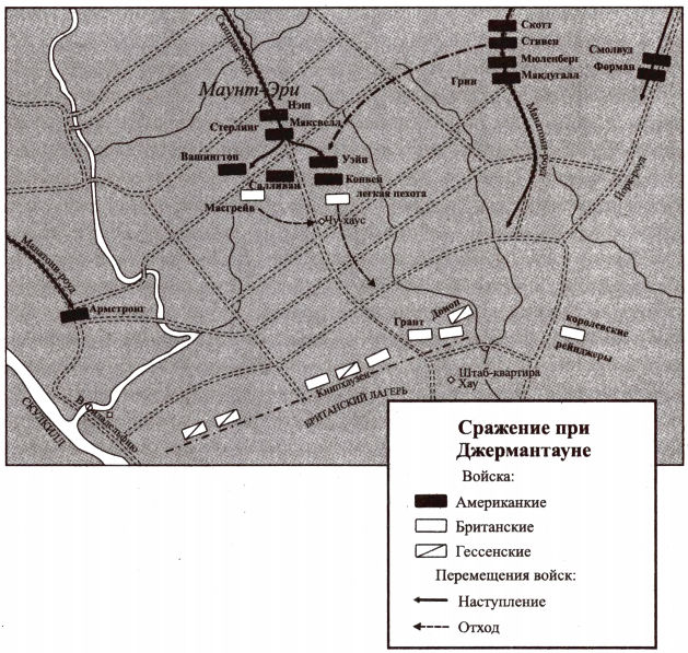 Когда Хау занял Филадельфию, Вашингтон расположился лагерем вдоль реки Скиппак-Крик в 40 км к западу от города. Однако он не собирался сидеть сложа руки. В нем горела неистребимая воля к действию, подпитываемая убеждением в том, что его солдаты, какими бы молодыми и неопытными они ни были, в случае необходимости будут сражаться, не щадя живота. Такая необходимость возникла в начале октября. Жизнь Хау в Филадельфии была далеко не безоблачной. Он контролировал город, но не реку Делавэр, обеспечивавшую удобный доступ в него. Американские форты, расположенные по берегам реки, блокировали все перевозки и не давали британским судам возможности доставлять своим соотечественникам припасы и подкрепления. В своем изолированном положении Хау опасался рассредоточивать солдат по гостиницам и частным домам Филадельфии, а потому расположил около девяти тысяч своих людей биваком под Джермантауном на восточном берегу Скулкилла, в пяти милях к северу от Филадельфии. Еще три тысячи были отправлены для сопровождения транспорта с припасами из Элктона, ползшего сухим путем. Четыре батальона остались в Филадельфии и еще два отправились для захвата Биллингспорта, стоявшего в 12 милях ниже по течению Делавэра. Таким образом, Хау расставил все свои фигуры [694] .