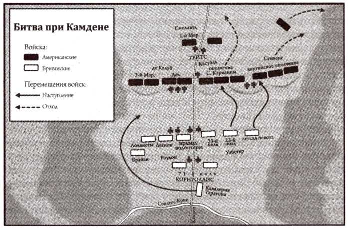Солдаты, нюхавшие порох, уважают победы, но они также ждут от признанных командиров эффективного командования. Гейтс с самого начала дал повод для сомнений. На следующий день после своего прибытия он упорядочил «Великую армию» — так он именовал изможденных континенталов, устроил ей смотр и 27 июля повел ее в Камден. Отдельные голоса протеста затихли перед лицом уверений Гейтса, что всего в паре дней пути за ним следуют «ром и провизия». И все же Ото Уильямс, главный адъютант Гейтса, уговорил его пойти окольным путем на запад, а не по прямой, поскольку в последнем случае им пришлось бы идти по песчаной и болотистой местности с крайне малочисленными фермами, которые к тому же были давно разграблены ополченцами обеих сторон [803] .