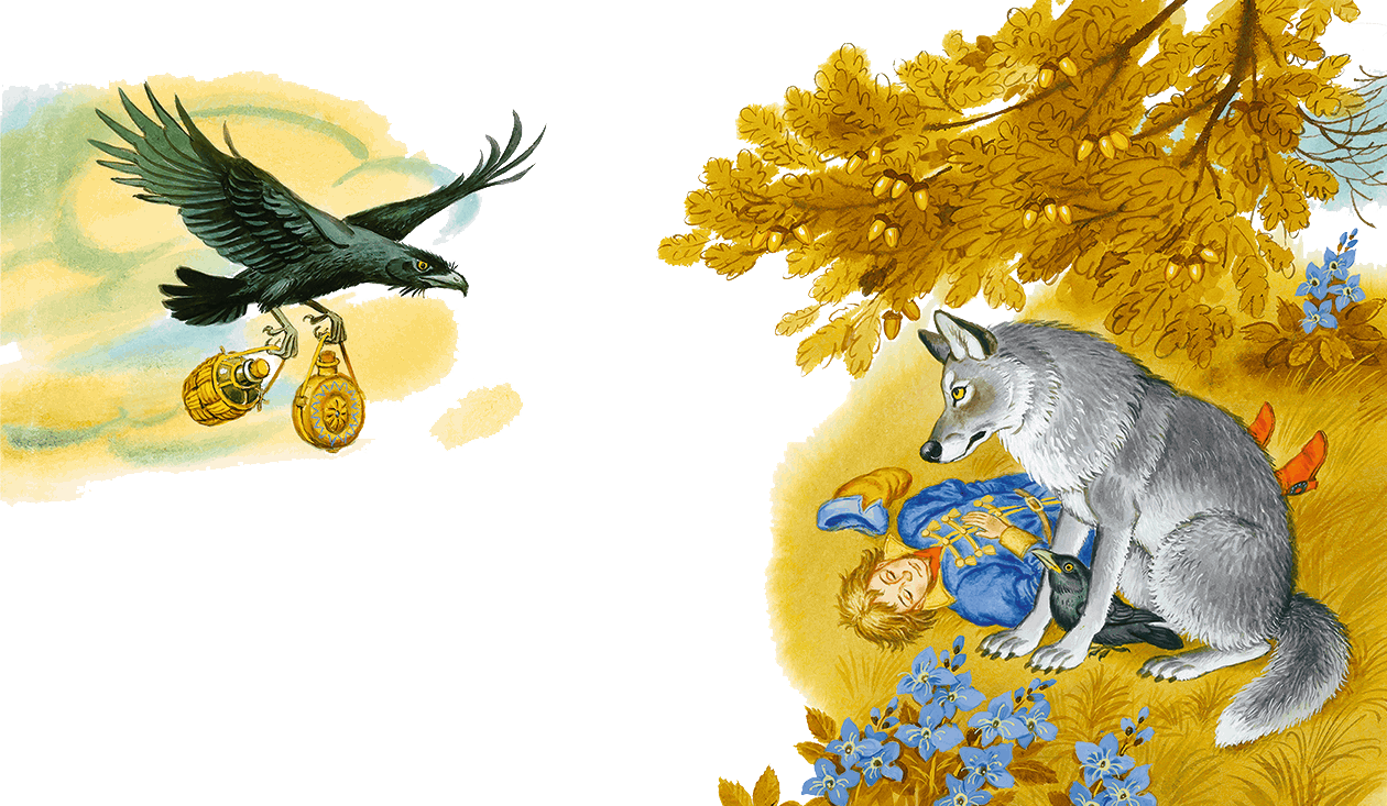 Ворон, делать нечего, полетел, а волк держит его воронёнка. Долго ли ворон летал, коротко ли, принёс он живой и мёртвой воды.