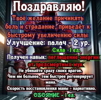 — 'ОГО! — обрадовался я. Оказывается система зачла мне гибель гномов. И я с тринадцатого уровня перепрыгнул на восемнадцатый! — Видимо среди них было много сильных гномов! — Однако, это было ещё не всё, что пришло от системы. И я открыл следующее сообщение.