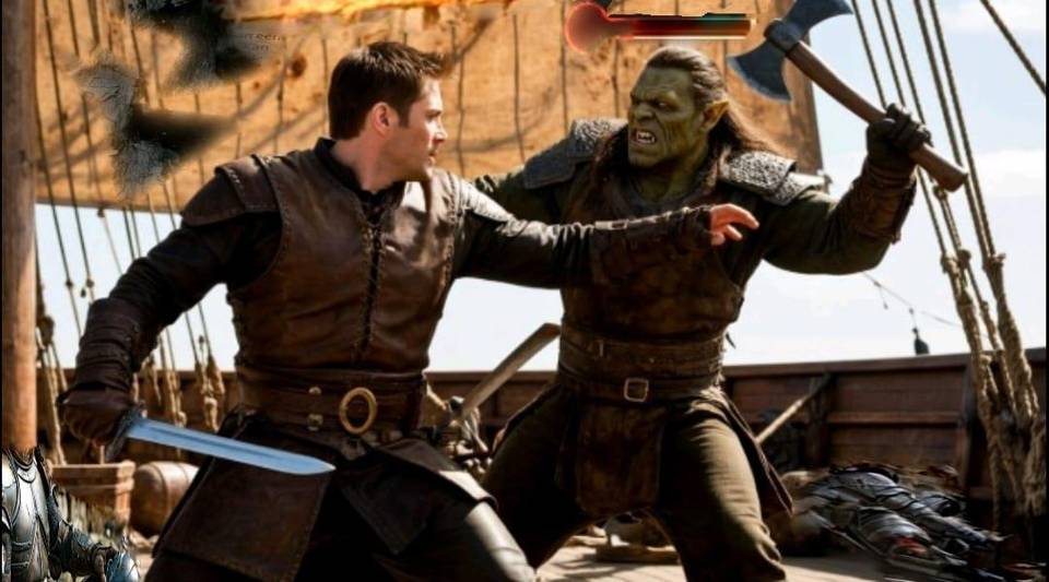 — Ааааррх! — взревел он. В руках он сжимал топор и щит. Орк кинулся к парню, у которого сильно дрожали руки. У матроса не было никакого шанса и…