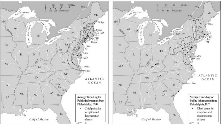 Все эти события помогли ускорить передачу информации из одного места в другое. В 1790 году на доставку новостей из Питтсбурга в Филадельфию уходило больше месяца, а к 1794 году этот срок сократился до десяти дней. В 1790 году на получение ответа на письмо, отправленное из Портленда (штат Мэн) в Саванну (штат Джорджия), уходило сорок дней, а к 1810 году этот срок сократился до двадцати семи дней. [1206]