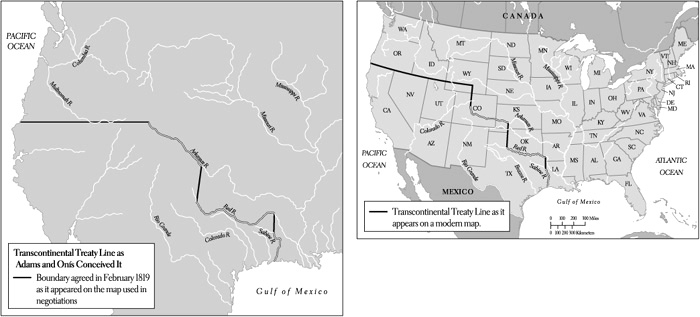 22 февраля 1819 года, в день рождения Джорджа Вашингтона, Адамс осуществил свою мечту, подписав одно из самых значительных достижений американской дипломатии — Вашингтонский трансконтинентальный договор. По условиям договора Испания не только признавала ранее захваченные американцами куски Западной Флориды, но и уступала Соединенным Штатам все остальные Флориды. Луизианская покупка была признана, а её западная граница установлена по рекам Сабин, Ред и Арканзас, а затем на север до 42-й параллели широты. Адамс упорно настаивал на том, чтобы границей служили западные берега, а не центры этих рек, чтобы монополизировать их для американской торговли. 42-я параллель была определена как граница Альта Калифорнии. К северу от этой линии Испания отказывалась от всех своих претензий в пользу Соединенных Штатов. Вдобавок к соглашению о совместной оккупации Орегона, недавно заключенному с Великобританией, этот Трансконтинентальный договор стал ещё одним большим шагом на пути превращения Соединенных Штатов в державу двух океанов. (Карты, с которыми велись переговоры, были неточными, поэтому линии, нанесенные на них, выглядели не так, как на современной карте). «Почти в час ночи, — записал Адамс в своём монументальном дневнике, — я завершил день словами горячей благодарности Дарителю всех благ… Признание определенной линии границы Южного моря составляет великую эпоху в нашей истории». [259]