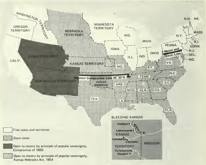 Так билль Канзаса-Небраски стал законом и привел к ряду результатов, предвиденных и непредвиденных, желаемых и нежелательных. После десяти лет усилий земля за рекой Миссури теперь имела территориальное правительство, к удовольствию некоторых предприимчивых типов в Уайандот-Сити и в Совет-Блаффс, которых, так или иначе, мало волновали моральные проблемы, будоражившие Конгресс. Предварительное условие для строительства Тихоокеанской железной дороги к западу от Чикаго или Сент-Луиса было выполнено, но на самом деле никакие пути не будут проложены до тех пор, пока сыновья северных и южных демократов, которые вместе принимали законопроект, не начнут убивать друг друга на полях сражений в Виргинии. Более непосредственное значение имел тот факт, что Демократическая партия раскололась на противоборствующие фракции, положив конец нелегкому перемирию 1850 года. Франклин Пирс мог бы стать символом окончательности компромисса, но главной заботой его администрации стали беспорядки «кровоточащего Канзаса».
