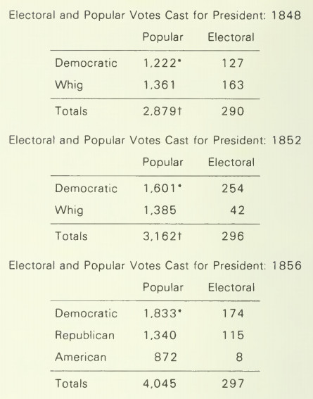 Хотя Бьюкенен получил 178 голосов выборщиков против 114 у Фремонта и 8 у Филлмора, он набрал лишь 45% голосов избирателей против 33% у Фремонта и 21% у Филлмора. В свободных штатах Фремонт получил 45,2%, Бьюкенен — 41,4%, Филлмор — 13,4%; в рабовладельческих штатах Бьюкенен — 56,1%, Филлмор — 43,9%, Фремон –.0005%. В Rayback, Fillmore, pp. 413–414, показано, что, хотя Филлмор, казалось бы, одерживает верх, в Кентукки процентное изменение составило менее 3 процентов от общего числа голосов (или 8016 голосов), Теннесси и Луизиана дали бы Филлмору достаточно голосов выборщиков, чтобы перебросить конкурс в Палату представителей.