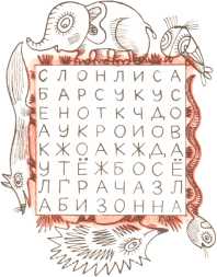 Совет „Круглого года": чтобы обнаружить певца, аккуратно карандашом вычеркните найденных вами в табличке зверей; слова расположены по горизонтали, вертикали и диагонали (сверху вниз). Выпишите оставшиеся буквы и составьте из них имя весёлого артиста.