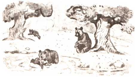 Из чащи вышли на берег большая бурая медведица, с ней два весёлых медвежонка и пестун — её годовалый сын, медвежья нянька.