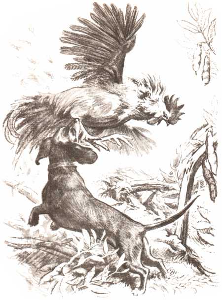 Собака выпустила птицу, и петух зашагал прочь.