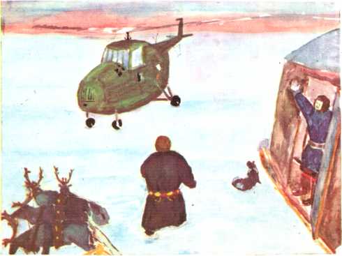 А вот среди снежных просторов небольшой домик. Присмотревшись, можно увидеть, что он стоит на лыжах. Называется этот домик «болок». Он приходит на смену чуму. В таком домике обычно размещается бригада пастухов, которая кочует вместе с оленьим стадом. А вообще-то ненцы живут теперь не в чумах и не в болках, а в обыкновенных деревянных домах, в сёлах и в посёлках. В тундру на кочевье бригаду пастухов доставляет вертолёт, а те, кто закончил смену, на этом же вертолёте улетят домой в посёлок. Смена пастухов — радостное событие.