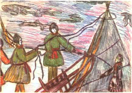 Но вот путь окончен. Надо устроиться на новом месте, поставить чум, развести огонь, сварить еду. А вокруг — снега и небо: синее, алое, голубое, лиловое... Наверное, об этом и вспоминают ненцы, когда говорят: «Ничего нет прекраснее тундры».