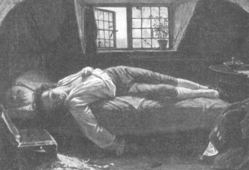Бледный утренний свет, проникая сквозь окно чердачной каморки, выхватывает из темноты фигуру юноши, лежащего на скромном диванчике. Сквозь сумрак комнаты проступает несколько красочных пятен. Справа — алый камзол, брошенный на стул. Слева, словно отблески от камзола, — рыжеватые пряди на вихрастой голове юноши. В центре композиции — самое крупное и сочное цветовое пятно: лиловые панталоны, которые более всего притягивают глаз, но менее всего вяжутся с образом служителя муз. Голова лежащего склонилась к открытому старинному сундуку с бумагами; в ногах — недогоревшая свеча (символ безвременно прерванной жизни). На полу — листы рукописи, разорванные в клочки, и опорожненный аптекарский флакон. Вверху, на подоконнике, — роза, роняющая лепестки. А за ней — взгляд снова устремляется к освещенному окну на заднем плане — различимы очертания куполов и крыш рассветного Лондона.