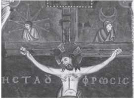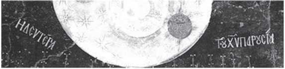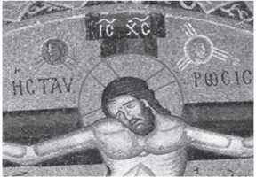 Первое слово, HACVTEГA, явно родственно HCTAY, второе разделяется на два TYXVПA PYCIA. Вероятно, и общий перевод должен быть близким к текстам на распятиях. На этой фреске Христос изображен в сонме святых и ангелов.