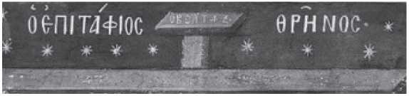 Первое слово читается как «эпитафия» – «надгробная надпись», возводимое к греч. taphos – «могила», соответственно, могло переводиться и как «могила», и как «набгробный памятник», т. к. соответствующей надписи нет. Конечно, весьма сложно крест распятия ассоциируется с надгробным памятником – могила Иисуса находилась не здесь. Но крест, на котором был распят Христос, стоял, по легенде, непосредственно на черепе, т. е. могиле, Адама, поэтому применение слов «надгробный памятник» относилось не столько к Иисусу, сколько к Адаму. Но Христос должен был погибнуть именно здесь. В былине о Василии Буслаеве этот сюжет хорошо раскрыт – череп на Голгофе предупреждает богатыря, что он должен здесь погибнуть и быть похоронен в одной могиле с ним под крестом на Голгофе.