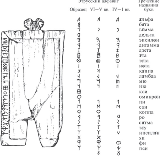 Эта Марсилианская таблица датируется VIII в. до н. э. Считается, что на ней приведен этрусский алфавит. И хотя не все присутствующие на таблице буквы есть в этрусских текстах, мы будем отталкиваться от него.