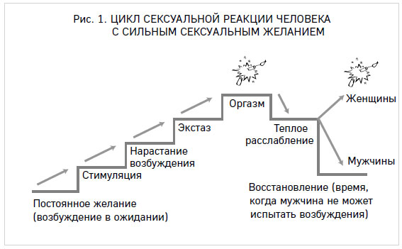 У людей с умеренным или высоким сексуальным желанием [10] , таких как Пол, оно кипит под поверхностью, готовое откликнуться возбуждением на малейшую стимуляцию. Такому человеку (мужчине или женщине) не нужно трудиться ради возбуждения – у него все происходит легко и быстро. А после стимуляции он шаг за шагом самым предсказуемым образом движется к оргазму. Цикл сексуальной реакции человека с умеренным или высоким уровнем тестостерона показан на рис. 1.