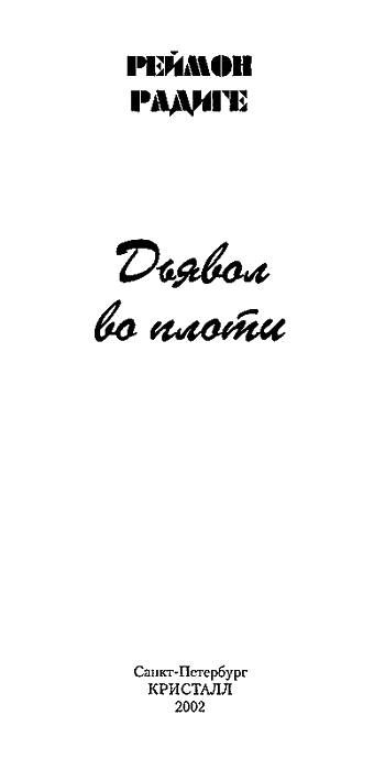 «Дьявол во плоти» (1920) — первый и наиболее значительный роман скандально известного французского писателя и поэта Реймона Радиге (18.VI. 1903—12.XII.1923), при жизни удостоенного титула «очарованного принца французской литературы». Роман семнадцатилетнего автора основан на отчасти автобиографическом материале и повествует об удивительно красивой и драматичной любви 16-летнего мальчика и взрослой девушки. Отличающийся исключительным психологизмом и написанный ясным живым языком роман Радиге предназначается для самой широкой читательской аудитории.