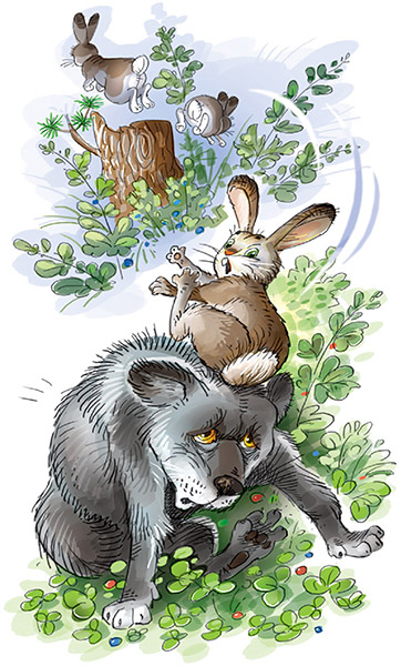 «Э, брат, погоди, вот тебя-то я и съем!» — подумал серый Волк и начал выглядывать, который заяц хвастается своей храбростью. А зайцы ничего не видят и веселятся пуще прежнего. Кончилось тем, что хвастун Заяц взобрался на пенёк, уселся на задние лапки и заговорил: